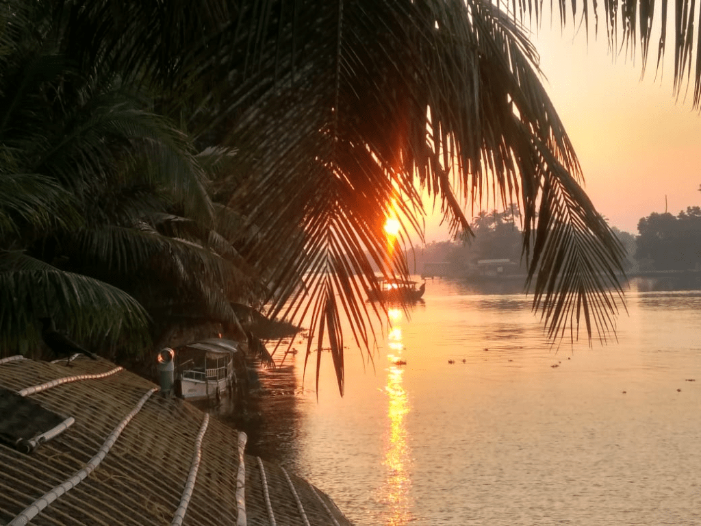 We came back to our houseboat at around 5.30 and there was local ayurvedic spa as well.Although we did not opt for it and instead went for a stroll beside the banks of the river and picked up a few raw mangoes :p After coming back to the boat they slowly took us to a place just beside our captain’s home and anchored there for the night.The sunset looked serene behind the coconut trees.