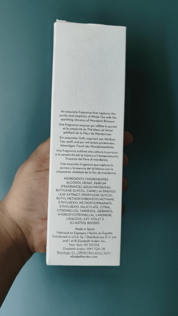 Elizabeth Arden is an American Brand and popular for its makeup and fragrance line. The packaging of the EDT spray is very minimalistic yet elegant. the outer packaging comes in a white textured paper box with mandarin orange blossoms illustrations. The bottle is a simple white glass spray bottle with a square white lid.